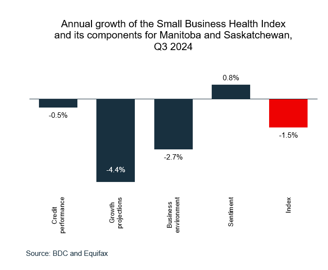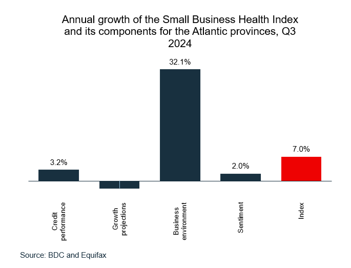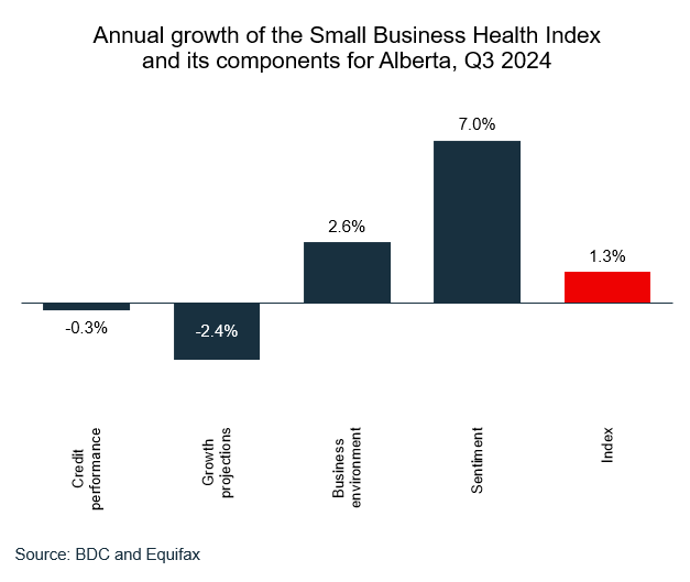 Improvement of the business environment was the largest contributor to this increase as the economy is starting to show signs of recovery. The inflation rate has returned to the Bank of Canada’s 2% target and the central bank started cutting its policy rate in June 2024. As a result, business sentiment is improving, with SMEs expecting a better economic outlook and access to credit is easing. However, sluggish sales and lower investment plans are still hindering SMEs, which is having a negative effect on the growth projections component. The credit performance of SMEs still hasn’t fully recovered from the impact of high interest rates, even though it is slowly trending in a positive direction.