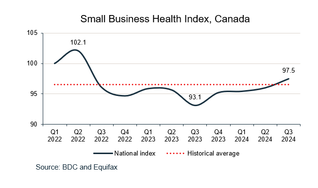 The health of Ontario small businesses has been improving since the beginning of 2024, reaching 97.5 in Q3 2024—growing by 3.2% year-over-year and 1.8% over the previous quarter.