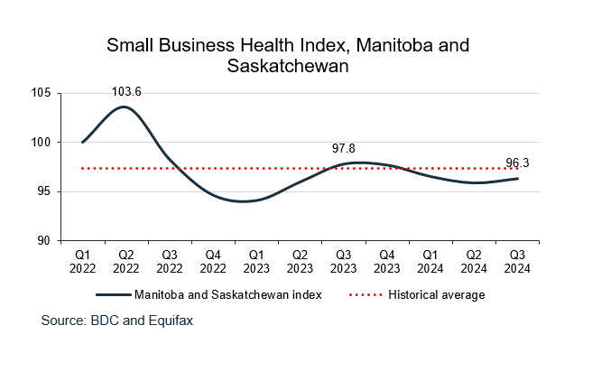 The Atlantic region outperformed the national index in Q3 2024. It stood at 103.2, posting a 7.0% increase over the same period last year and a rise of 3.1% over the previous quarter. The credit performance of businesses in the region improved while early delinquency rates decreased. There was also stronger employment and wage growth in these provinces, contributing to the strong rise of the business environment component. This also seemed to impact business sentiment, as SMEs had a more optimistic economic outlook.