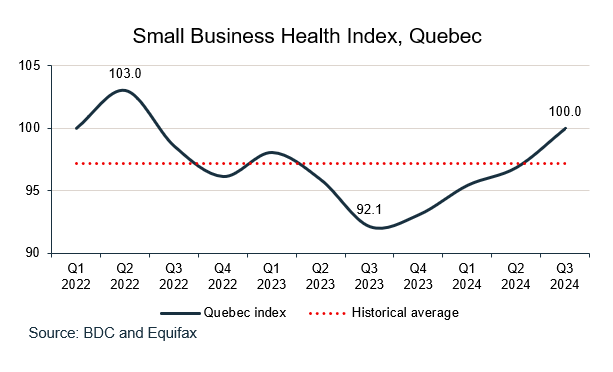 Business health in Quebec showed strong increase in Q3 2024 following a stagnant GDP in 2023. Overall, the index stood at 100.0, an 8.5% increase compared to a year ago and a 3.2% increase against the previous quarter.