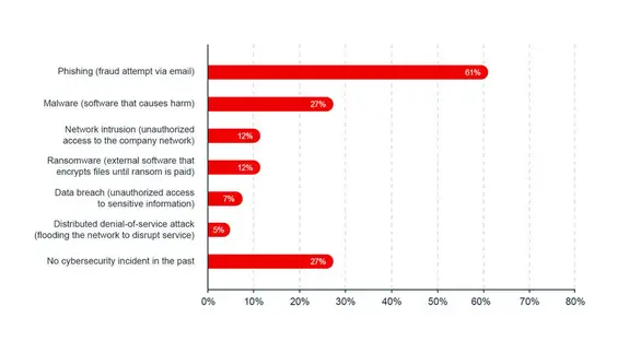 The feeling of being protected due to having revenue under a certain amount is even more surprising given that 73% of small businesses report having experienced a cybersecurity incident, ranging from phishing attempts to denial-of-service attacks.