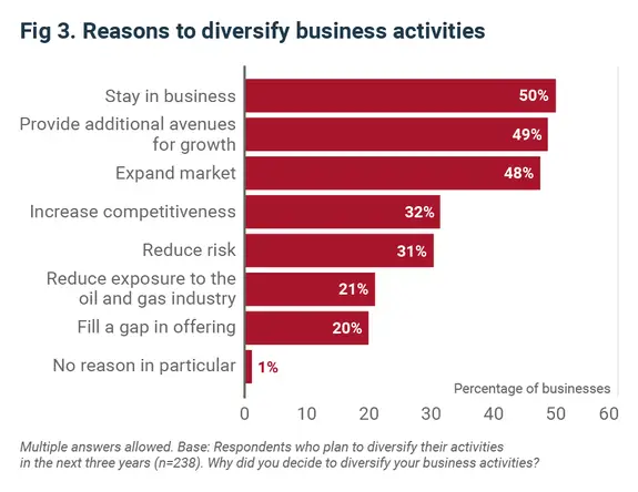 Although many companies in the region continue to be exposed to the oil prices, two-thirds of respondents have diversified in at least two ways, with large firms being more likely to have done so. Businesses tended to be well diversified in terms of their customer base but lagged on market expansion efforts and broadening the scope of their offerings.