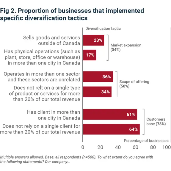 Among diversified businesses, those that pursued a market expansion strategy by selling outside of Canada or setting up operations in more than one Canadian city were three time more likely to experience high growth than their peers (23% vs 8%).