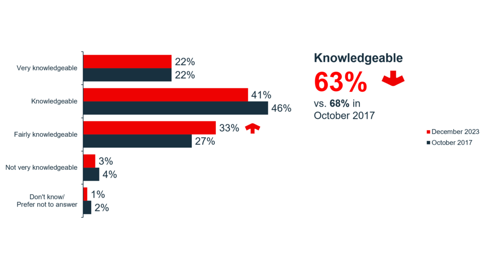 While 68% felt they were knowledgeable or very knowledgeable in 2017, only 63% responded the same way in 2023, a significant decrease.