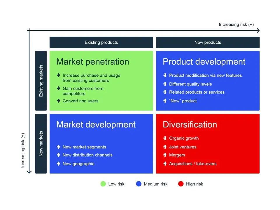 Created by Igor Ansoff, the Ansoff Matrix provides a framework to evaluate strategies for future business growth. It is simple to use and it helps decision makers understand the level of risk associated with different product-market strategies.