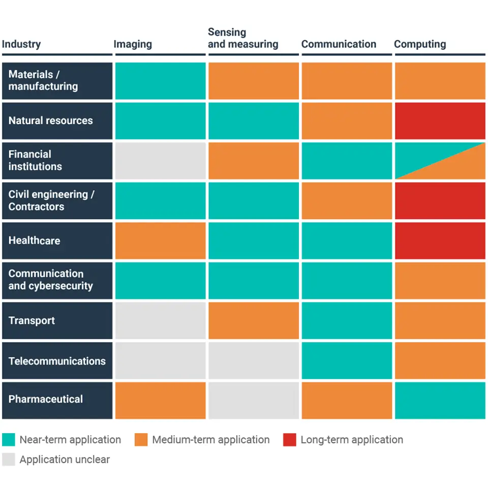 There are many types of quantum technologies, each with multiple commercial applications in a variety of industries. Here is an overview of the leading technologies, their related commercial applications and the most recent estimate of the value of their market opportunity.