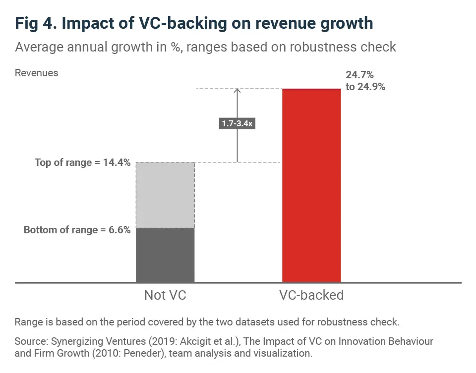 For revenue, VC support is associated with as much as 3.4 times higher average annual revenue growth (Fig. 4).