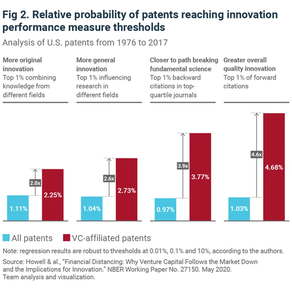 VC-backed firms also produce more fundamental and better-quality innovation than other firms by most measures. For example, an analysis of patent quality shows that VC-supported businesses produced significantly better innovation than non-VC-backed firms (Fig. 2).
