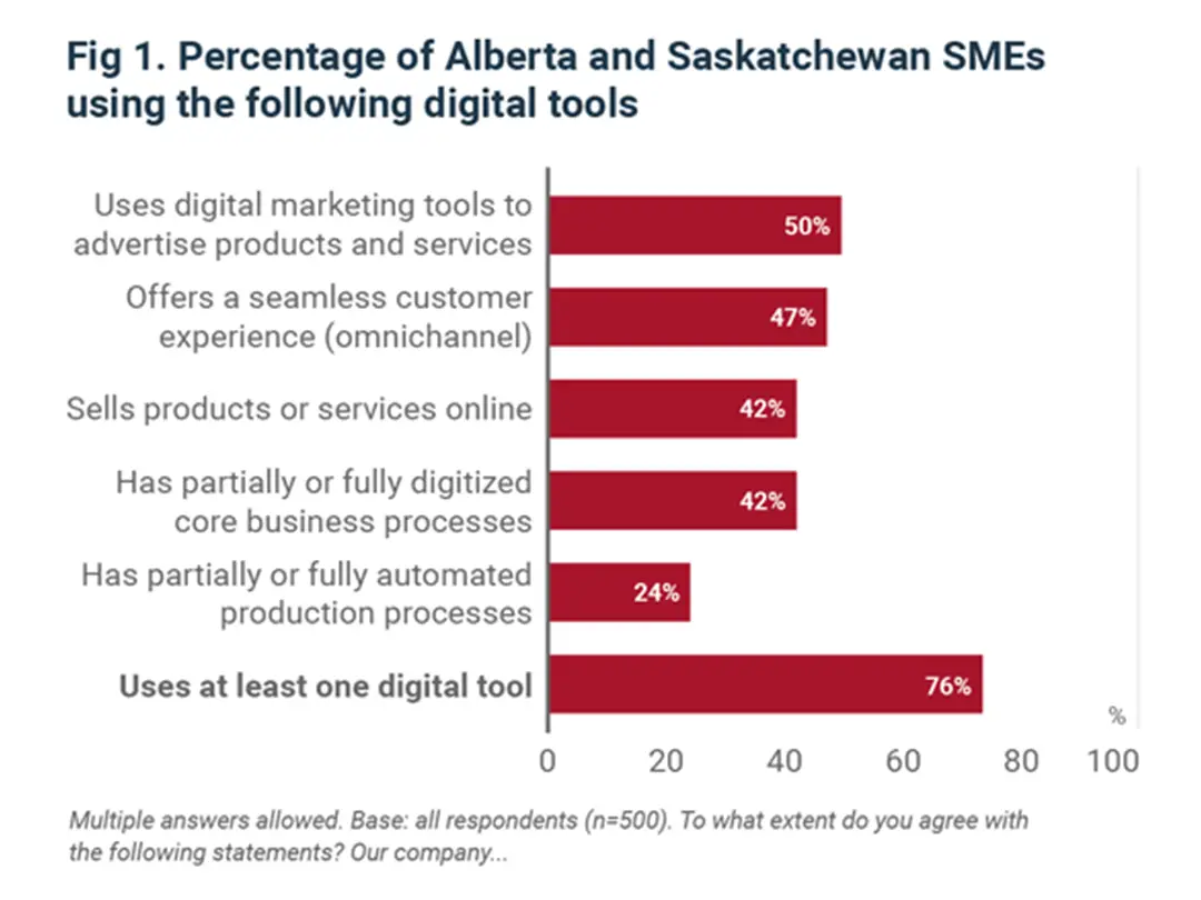 Our survey of 500 small and medium-sized business owners and decision-makers in Alberta and Saskatchewan found that over three-quarters are already using at least one type of digital technology. Marketing tools were the most popular, followed by creating an omnichannel customer experience and selling products and services online (Fig. 1).