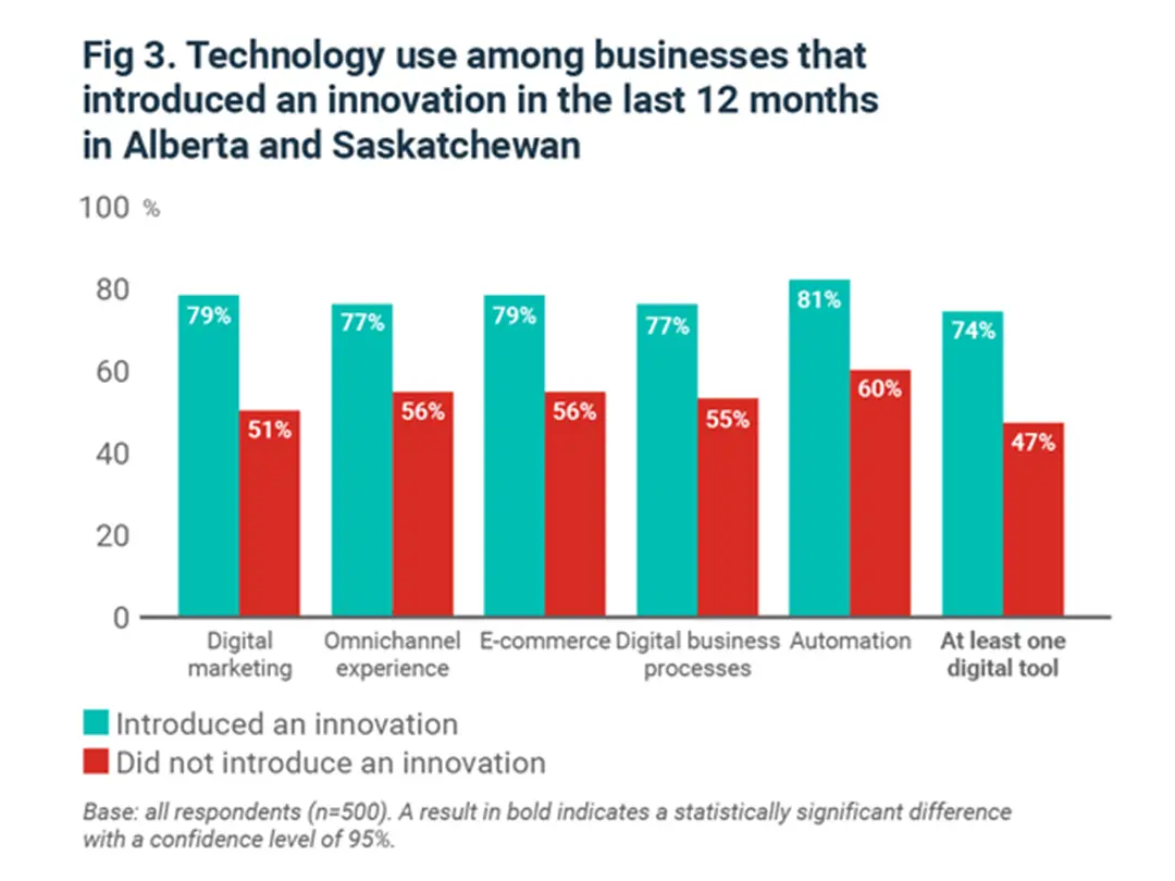 Meanwhile, our survey of Alberta and Saskatchewan entrepreneurs suggests that the use of digital technology is associated not only stronger growth, but also greater innovation.