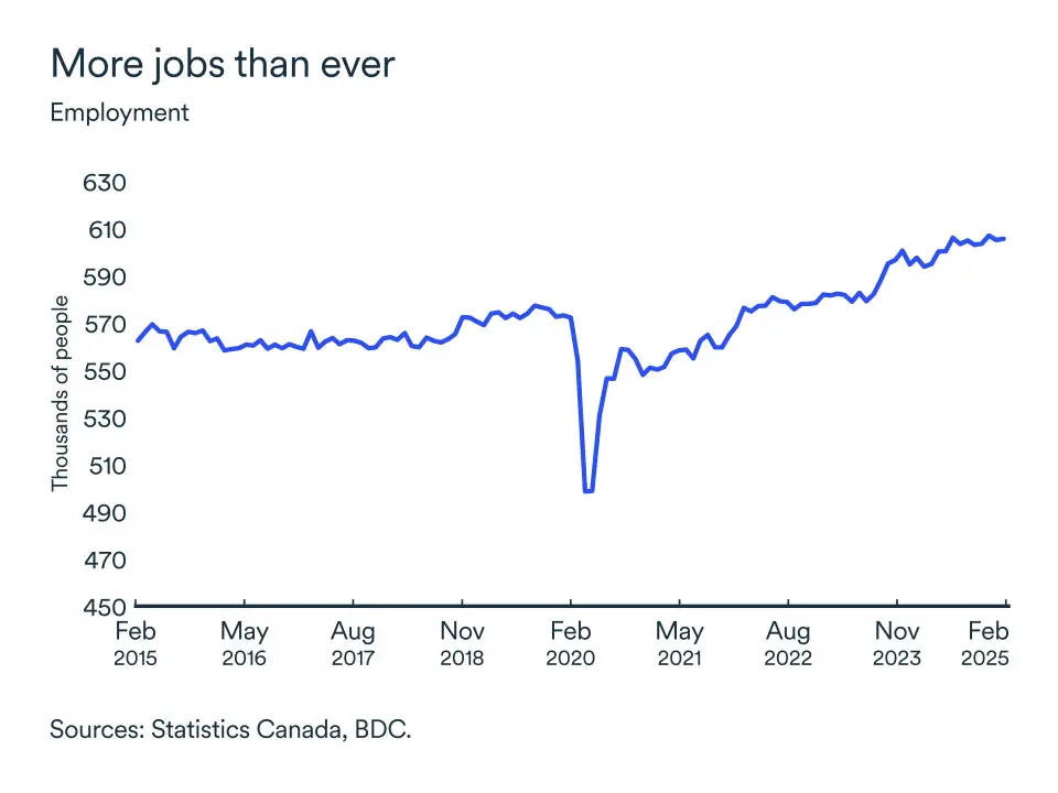 The Trans Mountain pipeline expansion created momentum in the oil sector with production reaching record levels last year. With lower interest rates and limited tariffs directly impacting the province, growth is expected to remain strong in 2025 and match last year’s level of 2.0%.