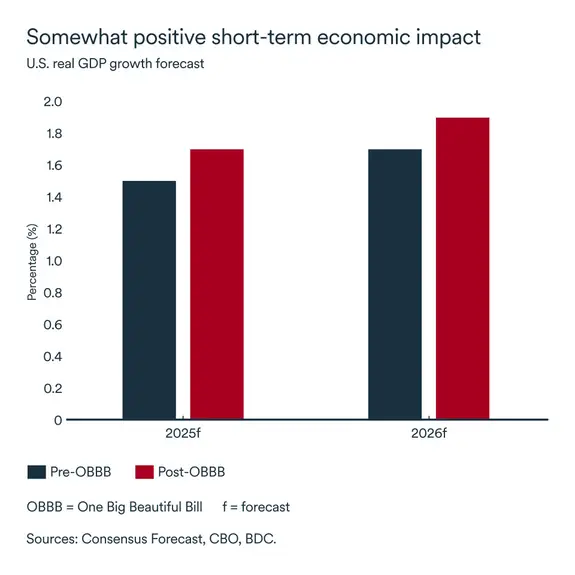 Before passage of the bill, economists expected the U.S. to grow by 1.5% in 2025 and 1.7% in 2026. Tax cuts are likely to stimulate U.S. demand, boosting consumption and investment in the short term. This could add an extra 0.2% to real GDP growth per year.