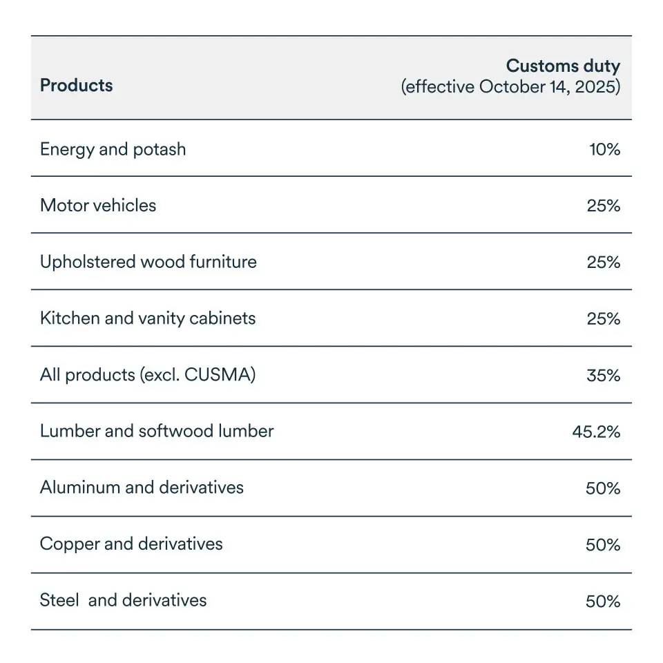 Among the most recent developments was a general increase in U.S. tariffs on Canadian products to 35% from 25% on all products not covered by the free trade agreement between Canada, the United States and Mexico.