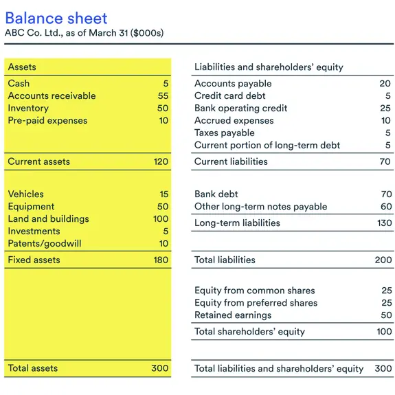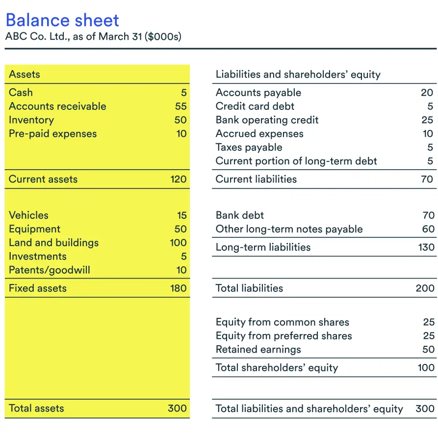 The sample balance sheet below shows that ABC Co. had $300,000 in assets as of March 31, 2023 ($120,000 in current assets and $180,000 in long-term assets).