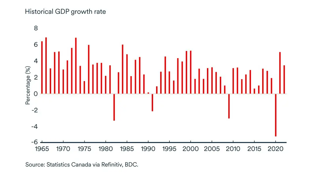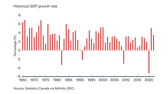 Canadian GDP growth has varied widely through the years. The chart below gives an overview of Canadian GDP growth between 1965 and 2022.