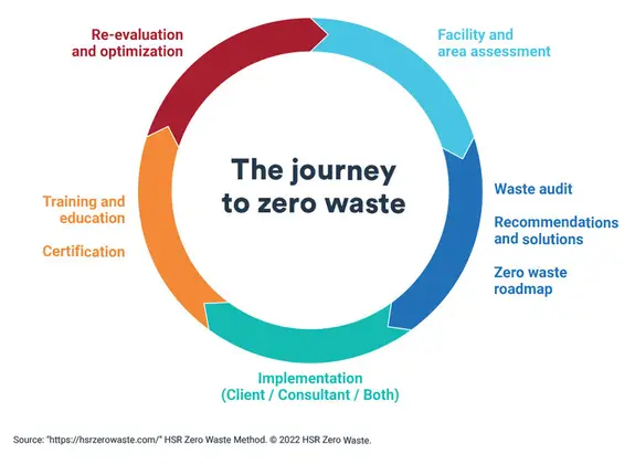 Kaminski uses a four-step process to help companies reduce their waste. Businesses can go through these steps independently or hire an outside expert on waste management. Kaminski suggests finding an expert specializing in “zero waste”—an approach that seeks to reduce waste to near-zero levels.