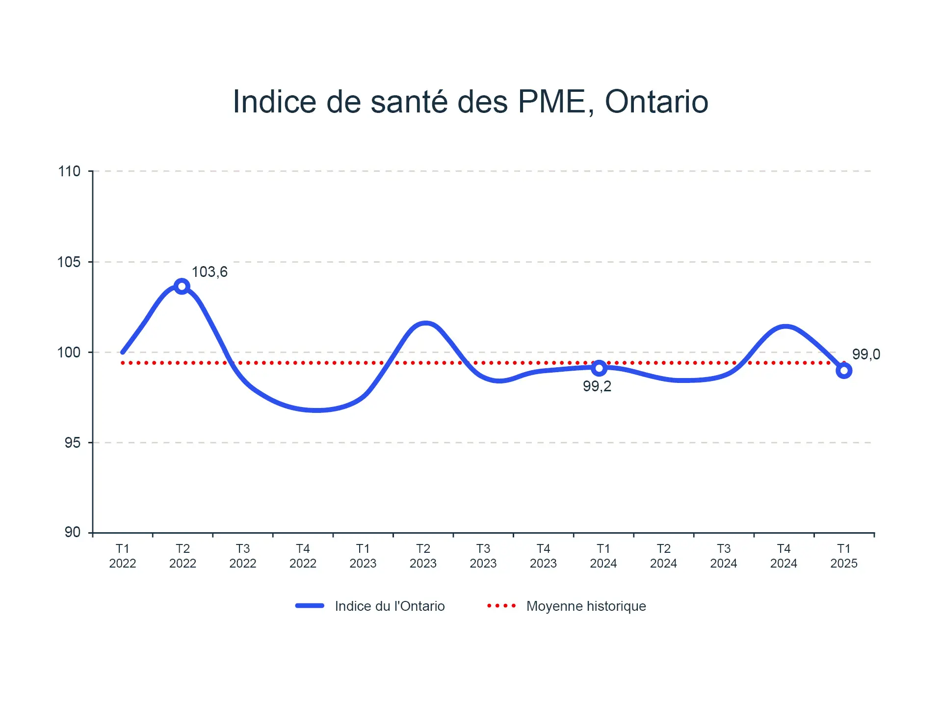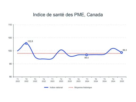 L’indice national a dépassé 100 à la fin de 2024 en raison de l’amélioration du paysage économique. Cependant, l’incertitude engendrée par les tensions commerciales avec les États-Unis et la Chine l’a fait revenir à sa moyenne historique. Au T1 2025, l’indice national s’est établi à 99,3, en baisse de 1,5% par rapport au trimestre précédent, mais tout de même en hausse de 0,9% par rapport au T1 2024. Malgré un environnement d’affaires généralement meilleur et une hausse de la confiance depuis l’année dernière, les PME sont encore aux prises avec des difficultés financières. L’incertitude économique brouille les perspectives pour les prochains mois.