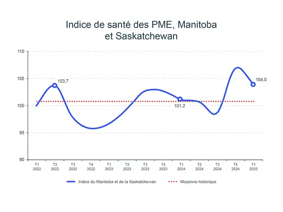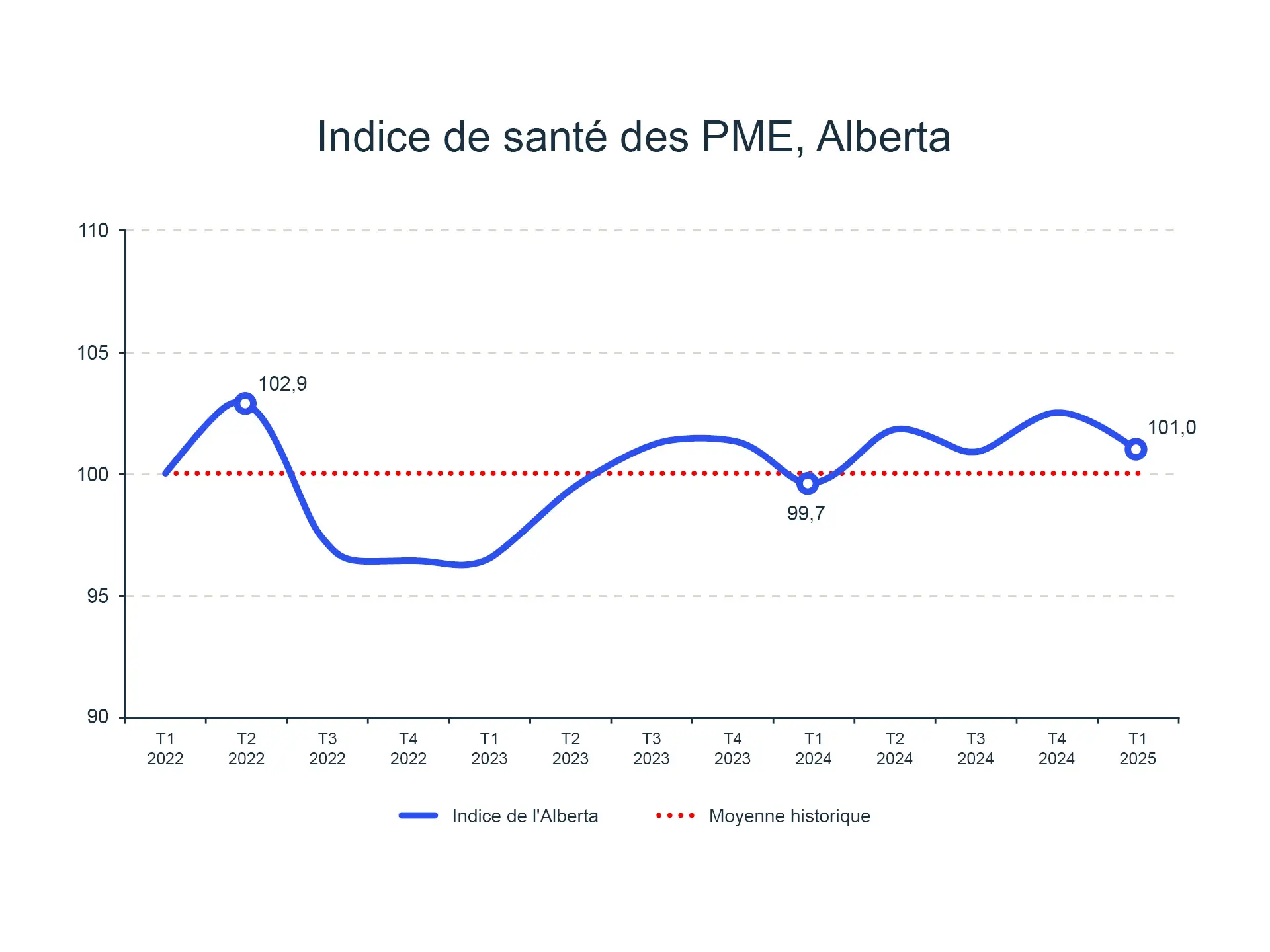 Les entreprises de l’Alberta sont prêtes à s’attaquer aux défis entraînés par les tarifs douaniers et les prix plus bas du pétrole. L’indice de l’Alberta est supérieur à la moyenne historique depuis le T2 2024, ce qui témoigne de la solidité des entreprises dans la province. Malgré un léger recul au dernier trimestre (-1.5%), l’indice s’élevait à 101,0, en hausse de 1,3% par rapport à son niveau d’il y a un an.
