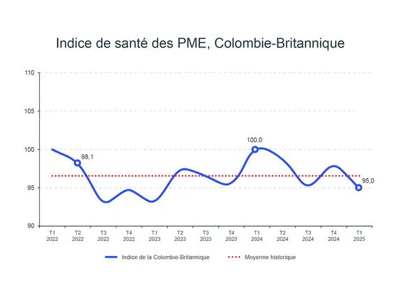L’indice de la Colombie-Britannique était le moins élevé des indices régionaux au dernier trimestre. Même s’il a monté légèrement à la fin de 2024, à 97,8, il a depuis baissé sous sa moyenne, à 95,0.