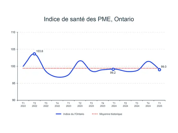 Malgré des améliorations trimestrielles et annuelles de la composante de l’environnement d’affaires, l’indice de l’Ontario a baissé à 99,0 au T1 2025. Cela représente une baisse de 2,3% par rapport au trimestre précédent, principalement sous l’influence de la baisse de la composante de performance du crédit, des attentes à la baisse en matière de croissance des entreprises et d’une baisse de la confiance en général. L’économie de l’Ontario est particulièrement exposée aux droits de douane touchant le secteur de l’automobile.