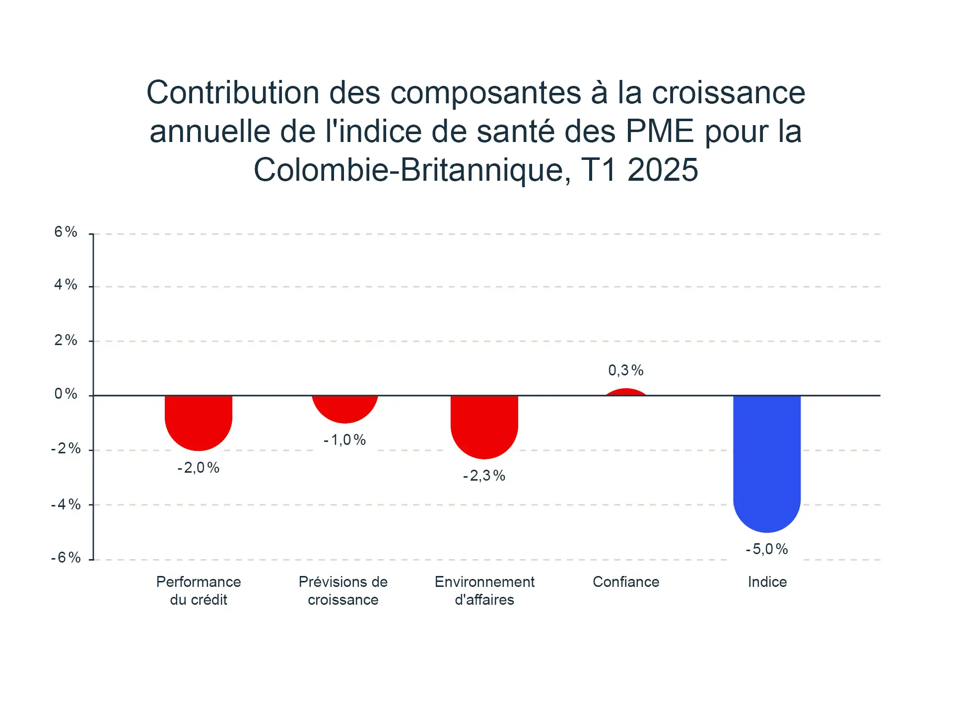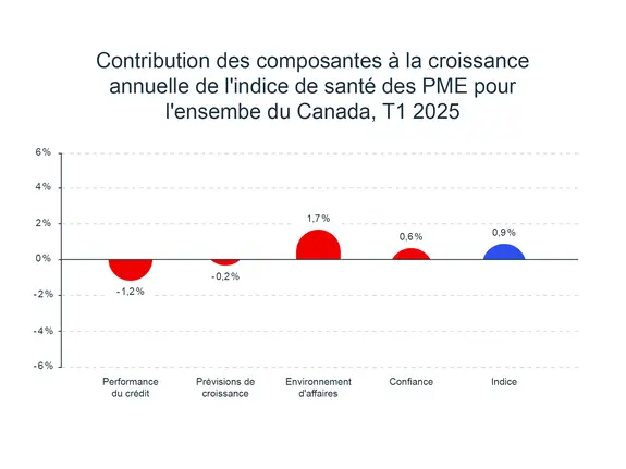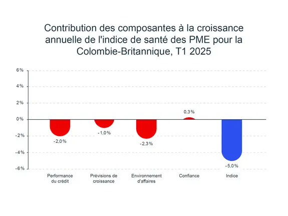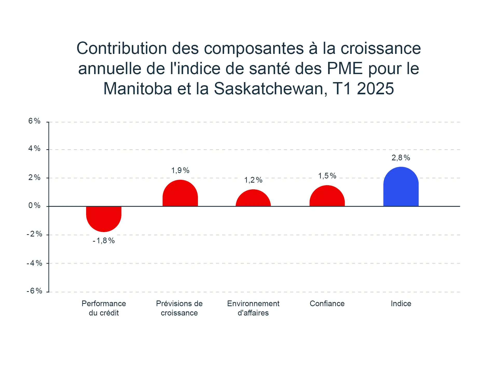 D’un autre côté, plusieurs facteurs ont freiné l’indice de l’Alberta. Les entreprises étaient moins optimistes à l’égard de l’économie que l’année dernière, comme en fait foi une baisse notable au premier trimestre de 2025. La performance du crédit a également fait baisser de 1,2% la croissance annuelle de l’indice. Les entreprises ont considérablement accru leur utilisation du crédit renouvelable au cours de la dernière année, ce qui a donné lieu à davantage de retards dans les prêts et de cas d’insolvabilité.