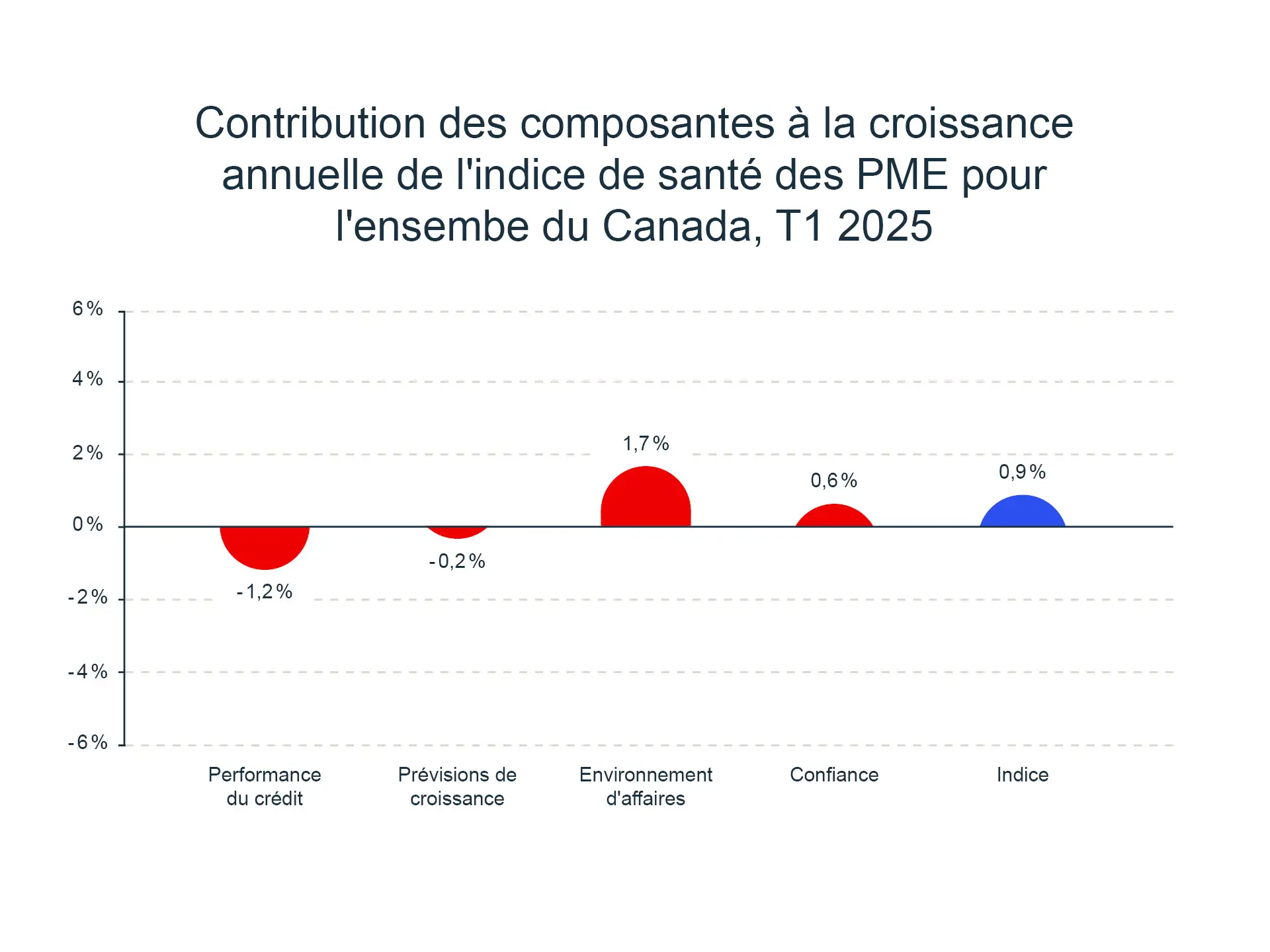 Les taux d’intérêt plus bas ont considérablement contribué à l’amélioration de l’indice par rapport à l’année dernière. Pour rappel, le taux directeur de la Banque du Canada, qui s’établissait encore à 5% il y a un an, se situe maintenant à 2,75%. Les effets de l’incertitude et des droits de douane avec plusieurs partenaires commerciaux importants n’étaient pas encore apparents dans la composante d’environnement d’affaires au T1 2025. Toutefois, malgré la stabilisation récente de l'économie mondiale, ils vont vraisemblablement peser sur cette composante au prochain trimestre.