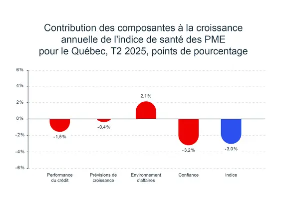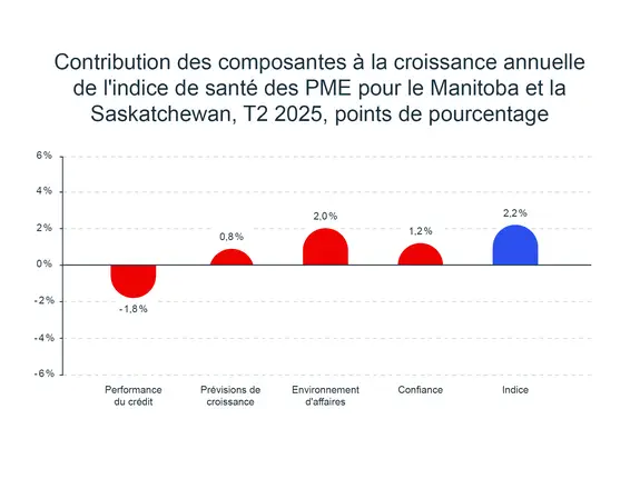 La santé des PME montre des signes d’amélioration. La composante de performance du crédit a augmenté de 0,9 % d’un trimestre à l’autre. L’utilisation du crédit a poursuivi sa tendance descendante d’un trimestre à l’autre, tandis que les taux de défaillance et de situations d’insolvabilité sont restés stables par rapport au premier trimestre de 2025. Dans les prochains mois, nous nous attendons à ce que la baisse des taux d’intérêt, la hausse de la confiance et les initiatives gouvernementales en matière de logement et de ressources naturelles stimulent la santé des PME.