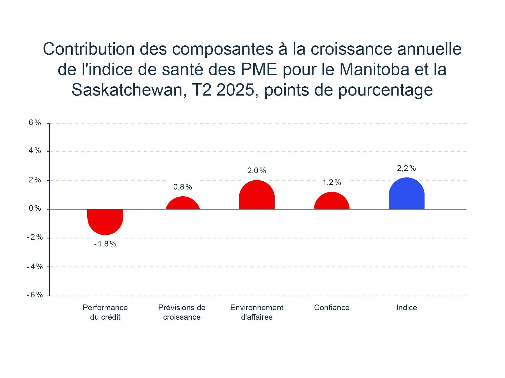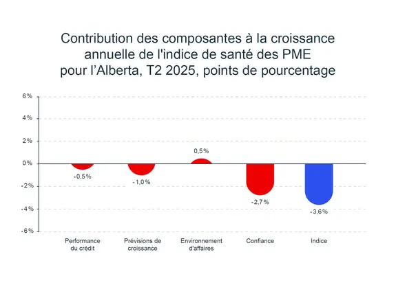 Malgré un léger regain de confiance cet été, les attentes des entrepreneurs n’ont pas évolué et la confiance des entreprises de l’Alberta a atteint son niveau le plus bas au deuxième trimestre. Une baisse de 13,8 % d’une année à l’autre a contribué à la baisse globale de l’indice pour la même période (-2,7 points de pourcentage). La confiance des entreprises a davantage viré au pessimisme en ce qui concerne les prévisions relatives à l’économie et aux flux de trésorerie. Bien que les nouvelles ouvertures d’entreprise et demandes de financement soient demeurées stables, les ventes, les embauches et les intentions d’investissement plus basses ont limité les prévisions de croissance. Ensemble, ces deux composantes ont grandement fait baisser l’indice de l’Alberta au deuxième trimestre de 2025.