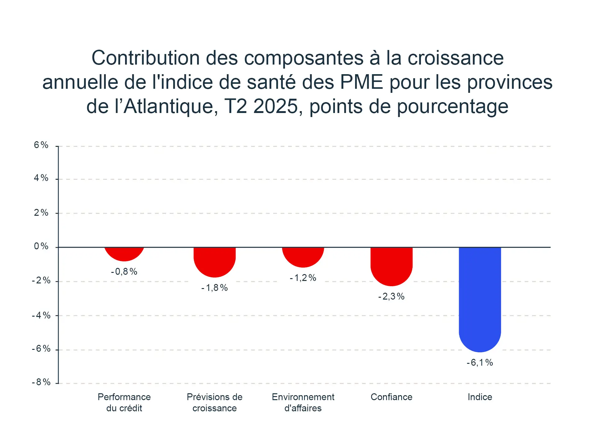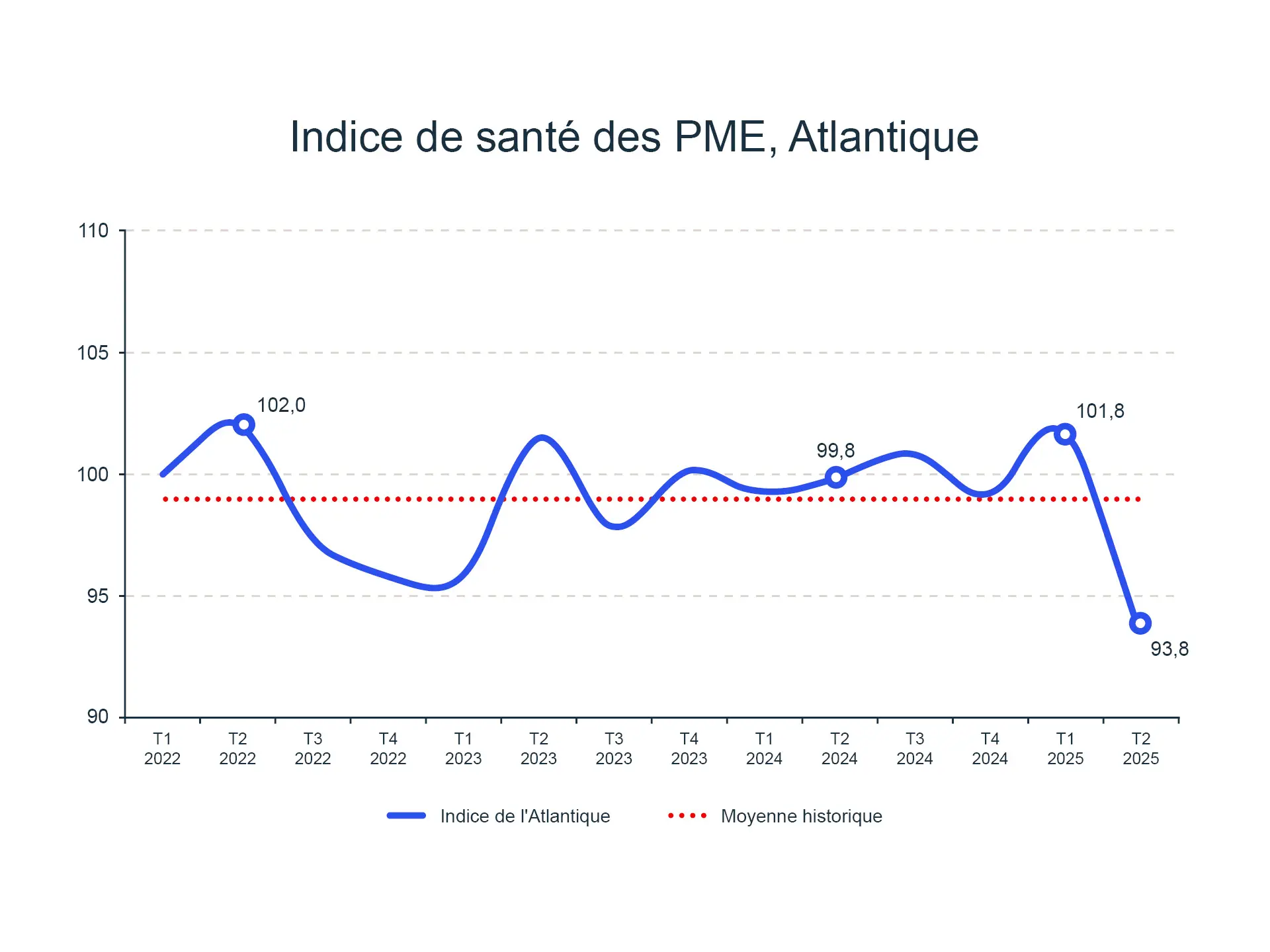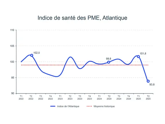 L’indice de la région de l’Atlantique a chuté de 7,8 % au deuxième trimestre, tombant à 93,8, son niveau le plus bas depuis la création de l’indice. Après un départ confiant en 2025, les PME des régions de l’Atlantique ont subi la charge des variations des marchés.