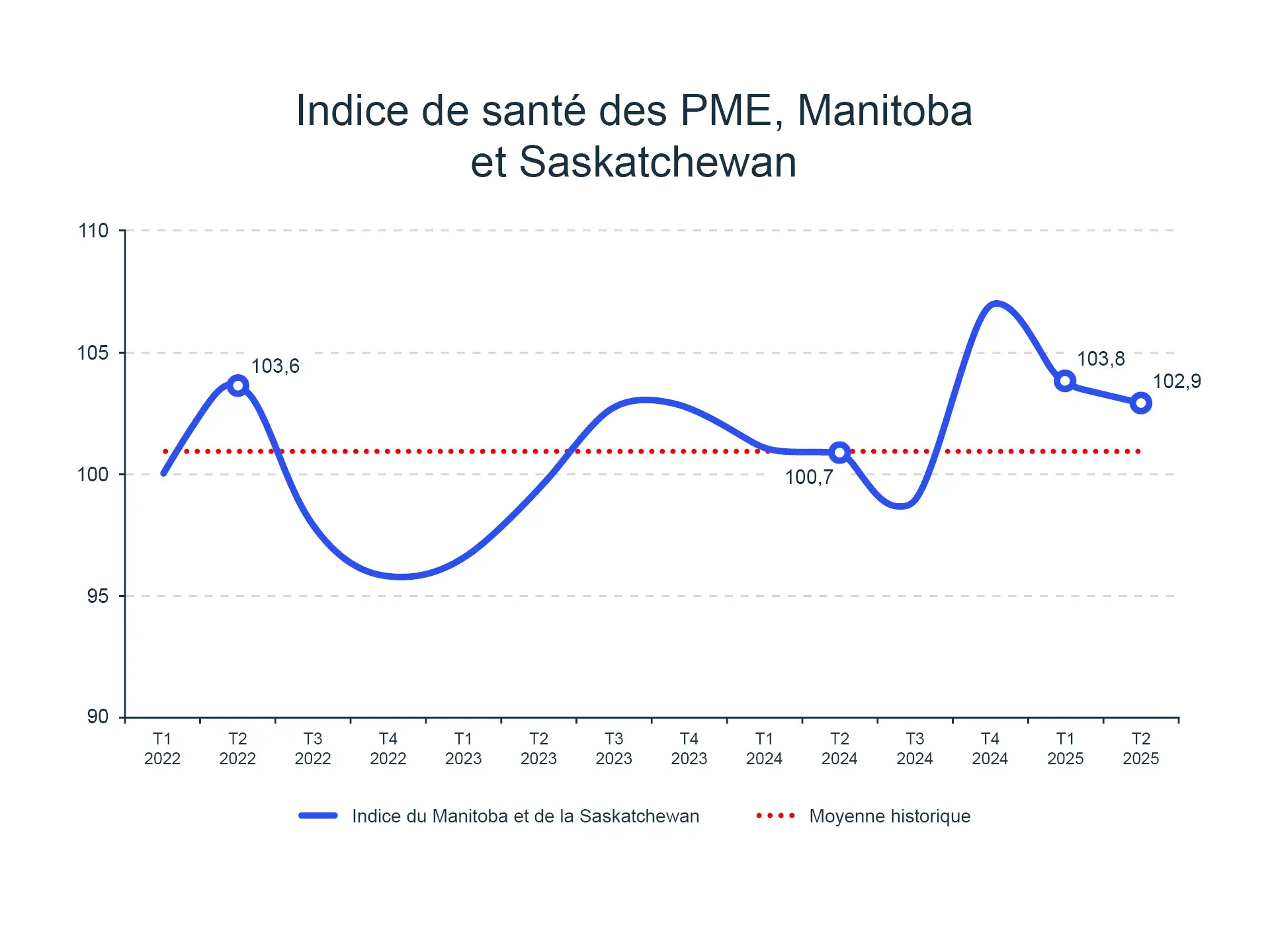 L’indice du Manitoba et de la Saskatchewan a baissé pour le deuxième trimestre consécutif, à 102,9, soit une baisse de 0,9 % par rapport au premier trimestre de 2025. Toutefois, l’indice reste supérieur à son niveau de l’an dernier.
