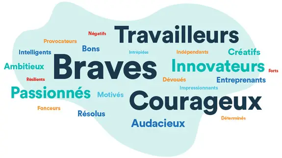 Invités à décrire les entrepreneures et entrepreneurs du Canada en un mot, les répondantes et répondants ont indiqué, entre autres, qu’elles et ils faisaient preuve de bravoure, de courage et d’innovation, en plus de travailler fort. (figure 1).