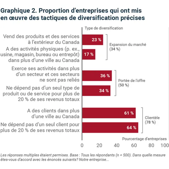 Les avantages de la diversification suggérés par le sondage sont étayés par les conclusions d’une étude que nous avons menée en 2015 à la suite d’un effondrement des prix du pétrole. Cette étude, fondée sur une enquête réalisée auprès de quelque 1 000 entreprises de l’Alberta, a révélé que la diversification (que ce soit par produit, par région ou par nombre de clientes et clients) était fortement corrélée à la réussite financière.