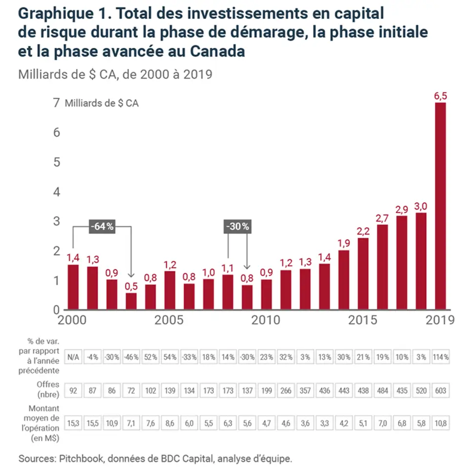 La récession du début des années 2000 et la crise financière de 2007-2009 ont entraîné un net recul des investissements en capital de risque, qui s’est exprimé par des réductions de 30 % à 64 % sur deux à quatre ans. Une chute similaire des investissements serait un revers pour le secteur canadien, qui a connu une année 2019 exceptionnelle. Les 6,5 milliards de dollars d’investissements en 2019 en ont fait de loin la meilleure année jamais enregistrée (graphique 1).