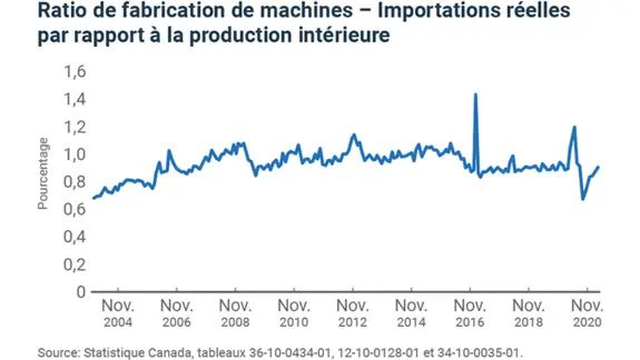 La fabrication de machines, par exemple, est une tête d’affiche de la relocalisation au Canada. Le rapport entre les importations et la production intérieure est en baisse depuis 2010, alors que la production, l’investissement et l’emploi sont tous en hausse constante.