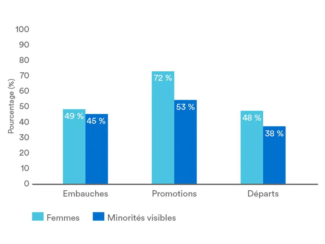 Graphique 5: Pourcentage de sociétés de commande où au moins 50 % des embauches, des promotions ou des départs ont touché des femmes ou des membres de minorités visibles