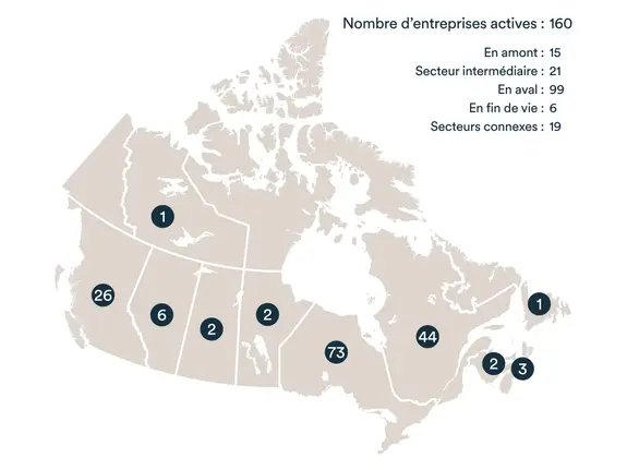 Les entreprises du segment en amont sont présentes partout au Canada. Mais plus de 75 % des entreprises du secteur intermédiaire et du segment en aval sont situées en Ontario et au Québec. La Colombie-Britannique compte également un certain nombre d’entreprises dans ces segments, en particulier dans le domaine des composants et des systèmes de batteries à combustible.