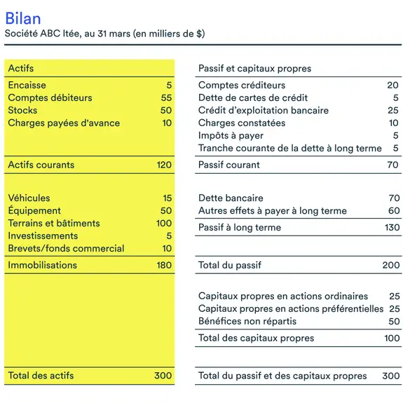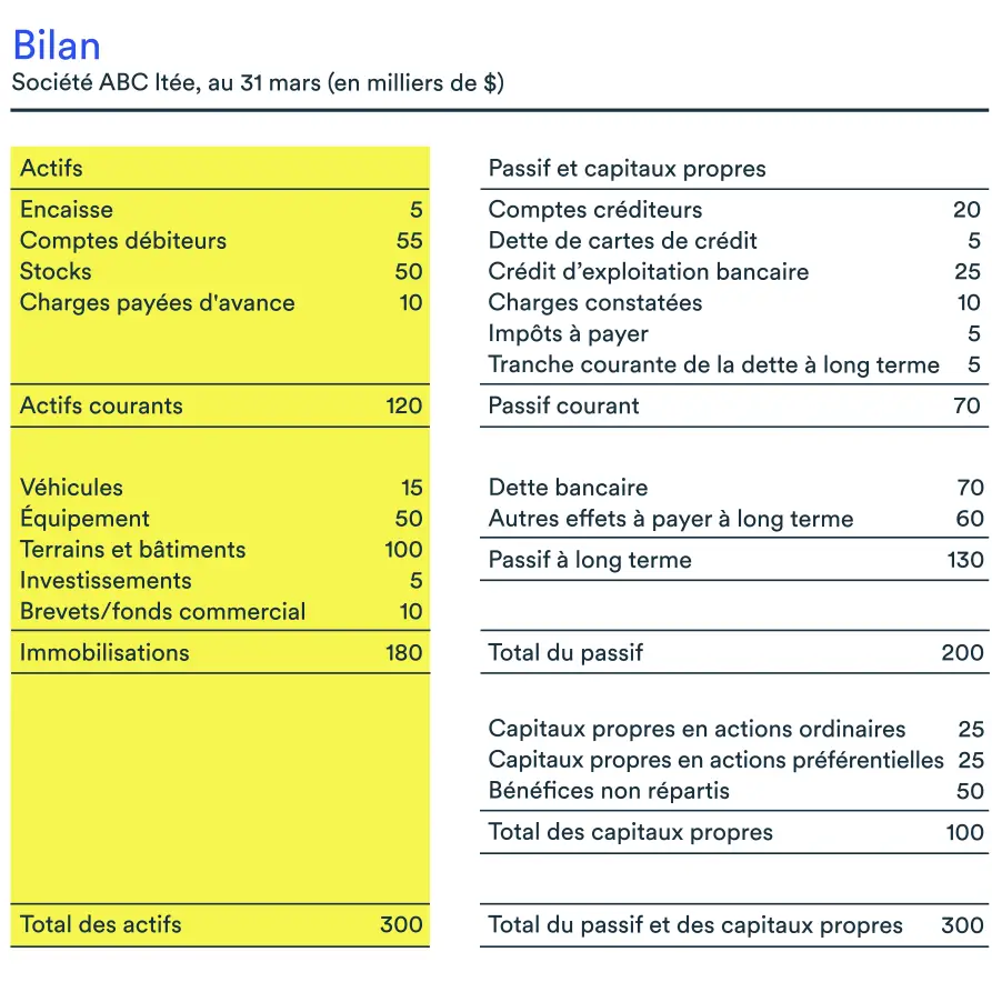 L’exemple de bilan ci-dessous montre que la société ABC avait des actifs de 300 000 $ au 31 mars 2023 (120 000 $ en actifs à court terme et 180 000 $ en actifs à long terme).