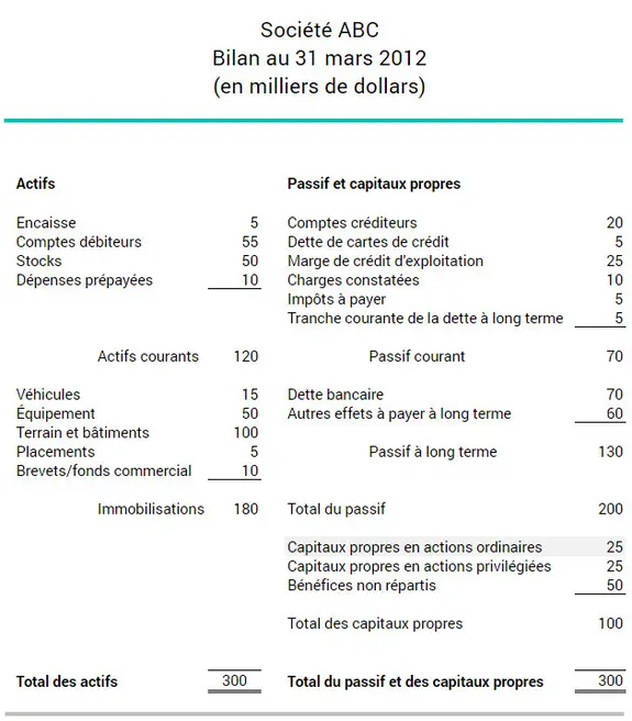 Les actions ordinaires et privilégiées figurent à titre de capitaux propres au bilan, comme le montre l’exemple ci-dessous: