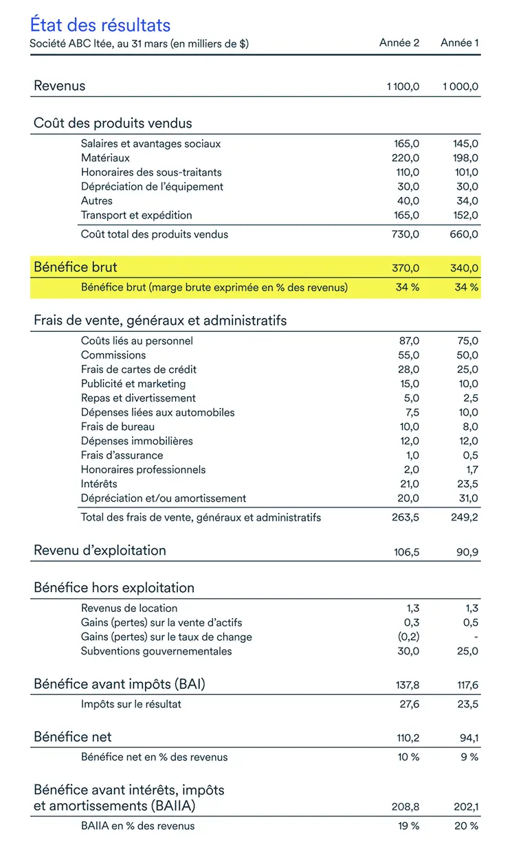 Dans l’exemple d’état des résultats ci-dessus pour ABC ltée, le revenu est passé de 1 000 000 $ à 1 100 000 $ entre l'année 1 et l'année 2, et le bénéfice brut a augmenté de 340 000 $ à 370 000 $, alors que la marge brute est restée la même à environ 34 %. Certains coûts ont diminué par rapport aux revenus, tandis que d’autres sont restés identiques ou ont augmenté. Par exemple, les salaires et les avantages sociaux étaient de 165 000 $ à l'année 2, soit 15 % des revenus. C’est un peu plus qu’à l'année 1, où les salaires et les avantages sociaux avaient coûté 145 000 $, soit 14,5 % des revenus de cette année-là.