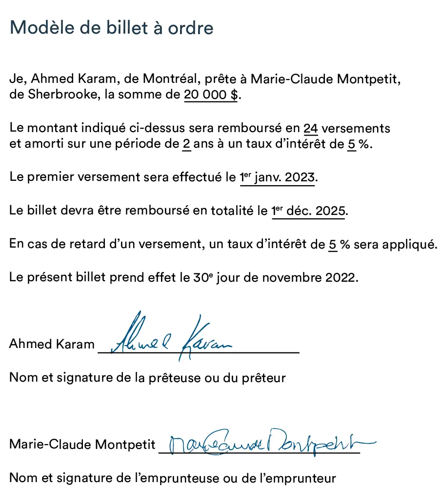 Le billet à ordre est une preuve papier de la dette contractée par l’emprunteur ou l’emprunteuse. Il indique le montant du prêt, le taux d’intérêt à payer ainsi que la date à laquelle le prêt doit être remboursé en totalité ou le calendrier de remboursement.
