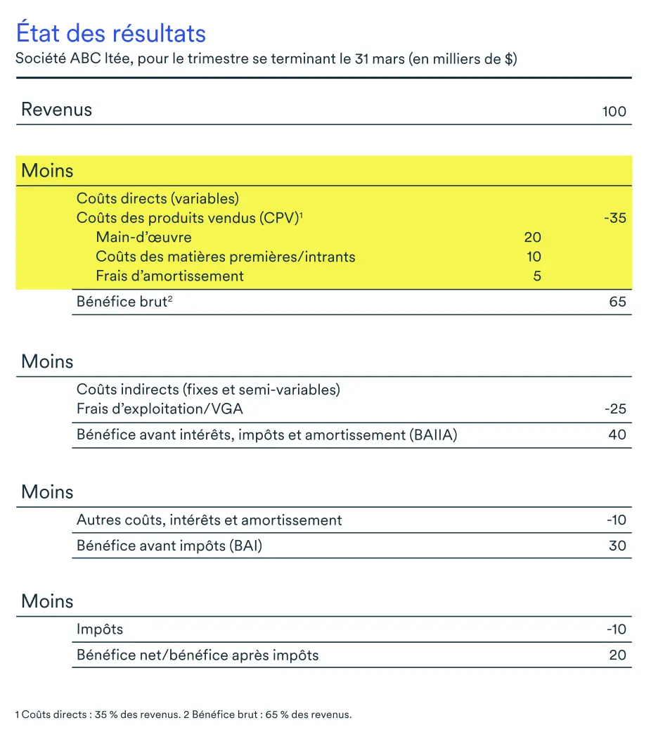 Les coûts directs sont directement liés aux revenus: s’il n’y a pas de vente, aucun coût direct n’est engagé. Par contre, d’autres types de dépenses, comme les frais d’exploitation, sont engagées indépendamment des ventes ou des revenus.