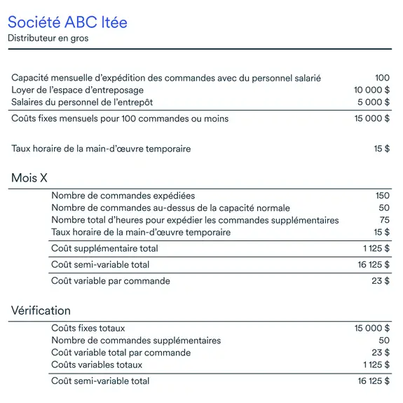 Pour une distributrice ou un distributeur grossiste, les coûts semi-variables comprennent le total des coûts fixes comme le loyer du local d’entreposage et les salaires du personnel de l’entrepôt, plus les coûts liés aux commandes dépassant la capacité normale, comme les salaires payés pour la main-d’œuvre temporaire.