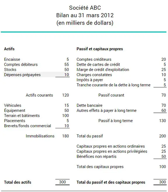 Le bilan ci-dessous montre que la société ABC détient des dépenses prépayées de 10 000 $ au 31 mars 2012. Les actifs courants de l’entreprise sont classés par ordre de liquidité décroissante. Ainsi, les dépenses prépayées figurent en dernier.