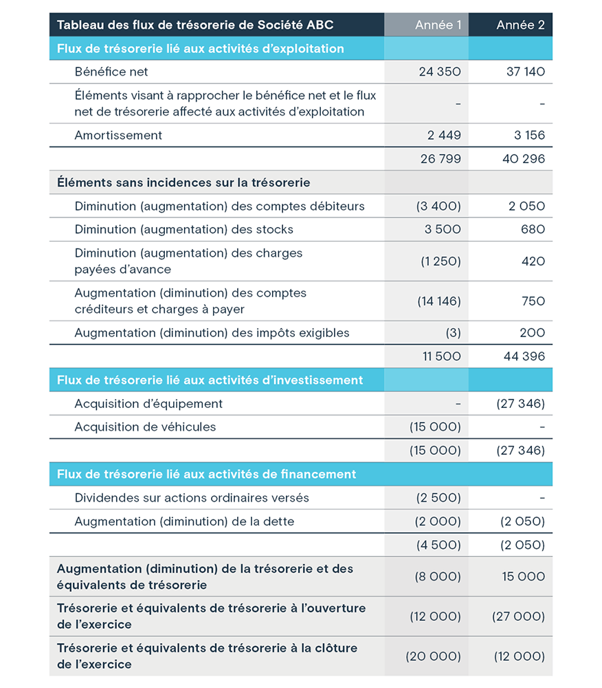 Le chiffre entre parenthèses correspond à une diminution de la situation de trésorerie. Ainsi, dans le cas du [(3 400)], ABC a émis une facture et enregistré la vente à titre de revenu, mais n’a pas encore perçu le paiement. Autrement dit, le solde des comptes débiteurs de l’année 1 serait plus élevé que celui de l’année 0.