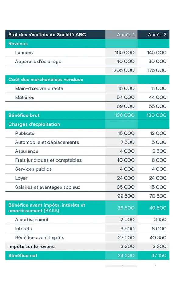 On examine le bénéfice net pour voir si l’entreprise réalise un profit. De plus, on peut aussi comparer l’état des résultats de différentes années pour voir les variations du bénéfice d’une année à l’autre. Il est aussi possible d’utiliser le bénéfice net pour comparer l’entreprise à d’autres du même secteur.