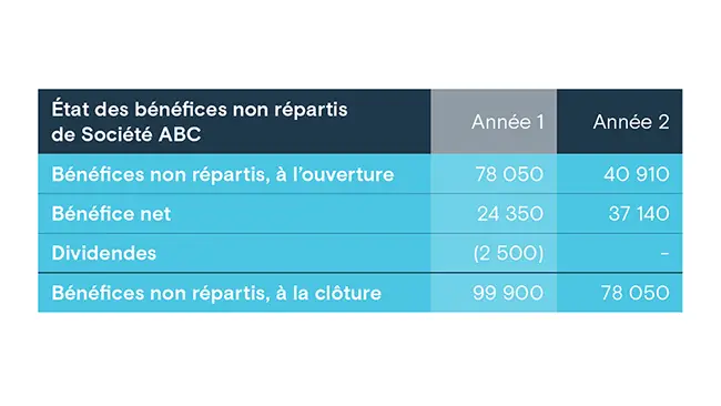 L’état des bénéfices non répartis indique les bénéfices cumulatifs de l’entreprise après le paiement des dividendes ou les distributions aux actionnaires. Il montre également les variations du compte des bénéfices non répartis entre les périodes d’ouverture et de clôture de chaque bilan. Il peut aussi présenter des ajustements provenant d’opération entre entités apparentées.