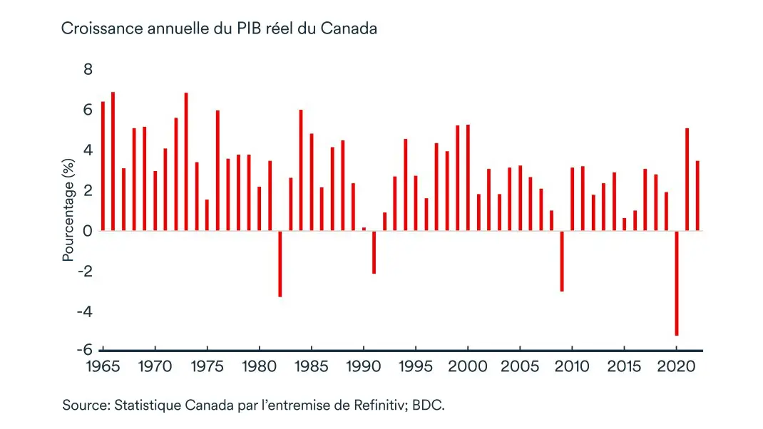 La croissance du PIB canadien a varié considérablement au fil des années. Le graphique ci-dessous donne un aperçu de la croissance du PIB canadien entre 1965 et 2022.