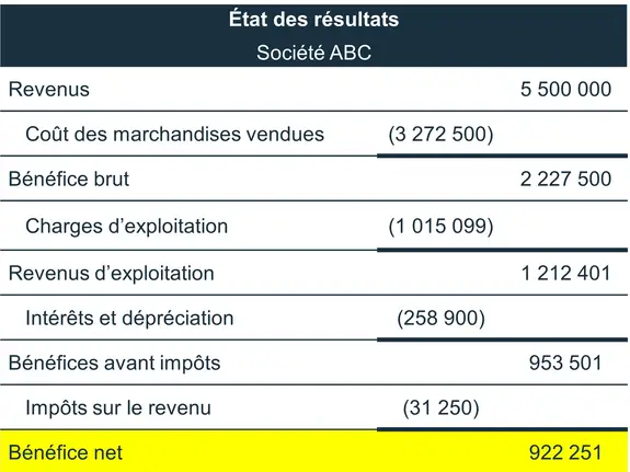 Exemple d’un état des résultats où l’on trouve le bénéfice net: