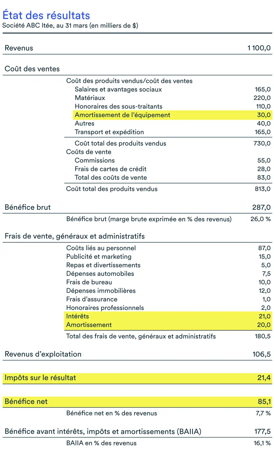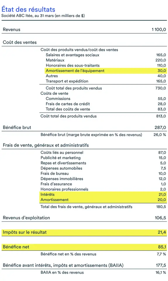 Le BAIIA est le bénéfice de votre entreprise avant intérêts, impôts et amortissements. Généralement, il n’apparaît pas clairement dans votre état des résultats, c’est une mesure à produire. Pour l’obtenir, vous devez faire la somme de différentes données qui se trouvent dans l’état des résultats, soit: