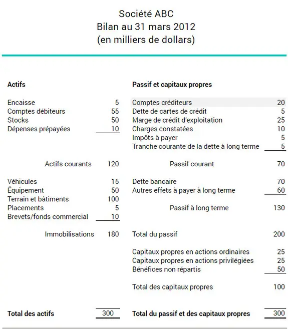 L’exemple ci-dessous montre comment la société ABC calcule sa rotation des comptes créditeurs à partir des renseignements fournis dans son état des résultats et son bilan: